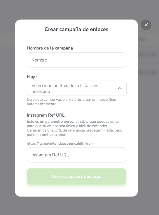 Haga clic en el botón verde "Crear campaña de enlaces". Agregue el nombre de la campaña y la URL de referencia de Instagram se generará automáticamente cuando haga clic en "Crear campaña":