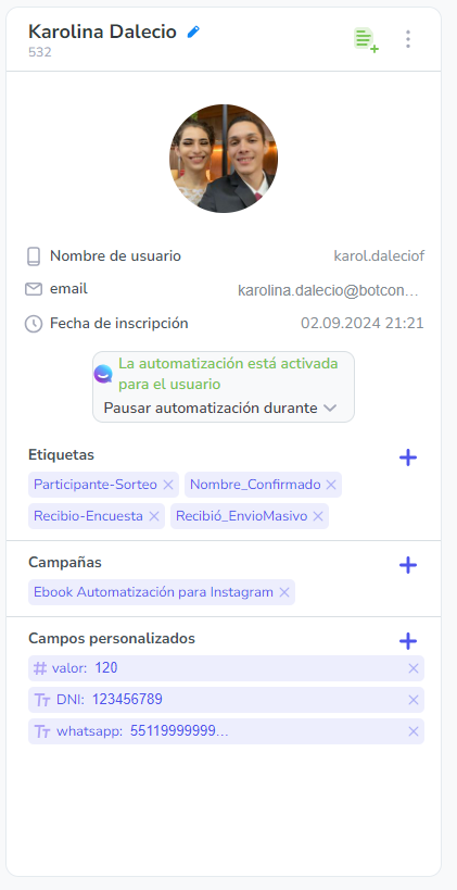 1. Cambiar manualmente el nombre del contacto: Dentro de la tarjeta, tienes la posibilidad de cambiar manualmente el nombre del contacto. Esta funcionalidad es útil cuando el nombre proporcionado por el usuario en Instagram no se corresponde con su nombre real o preferido, permitiendo una mayor personalización en el servicio y una mejor organización interna.